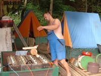 ... děti kolem grilu s kýtou ...