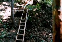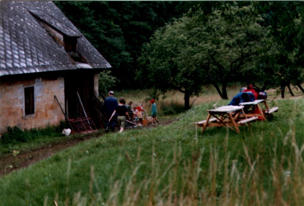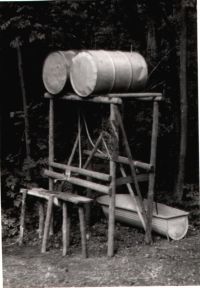 ... křídlová pumpa v potoce ... trubka někam nahoru ... umývárna se zásobou vody ...