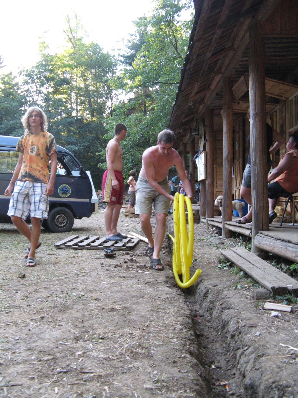 ... vyměřování, kopání a začištění trativodu pod okrajem střechy. Už nikdy bláto ...