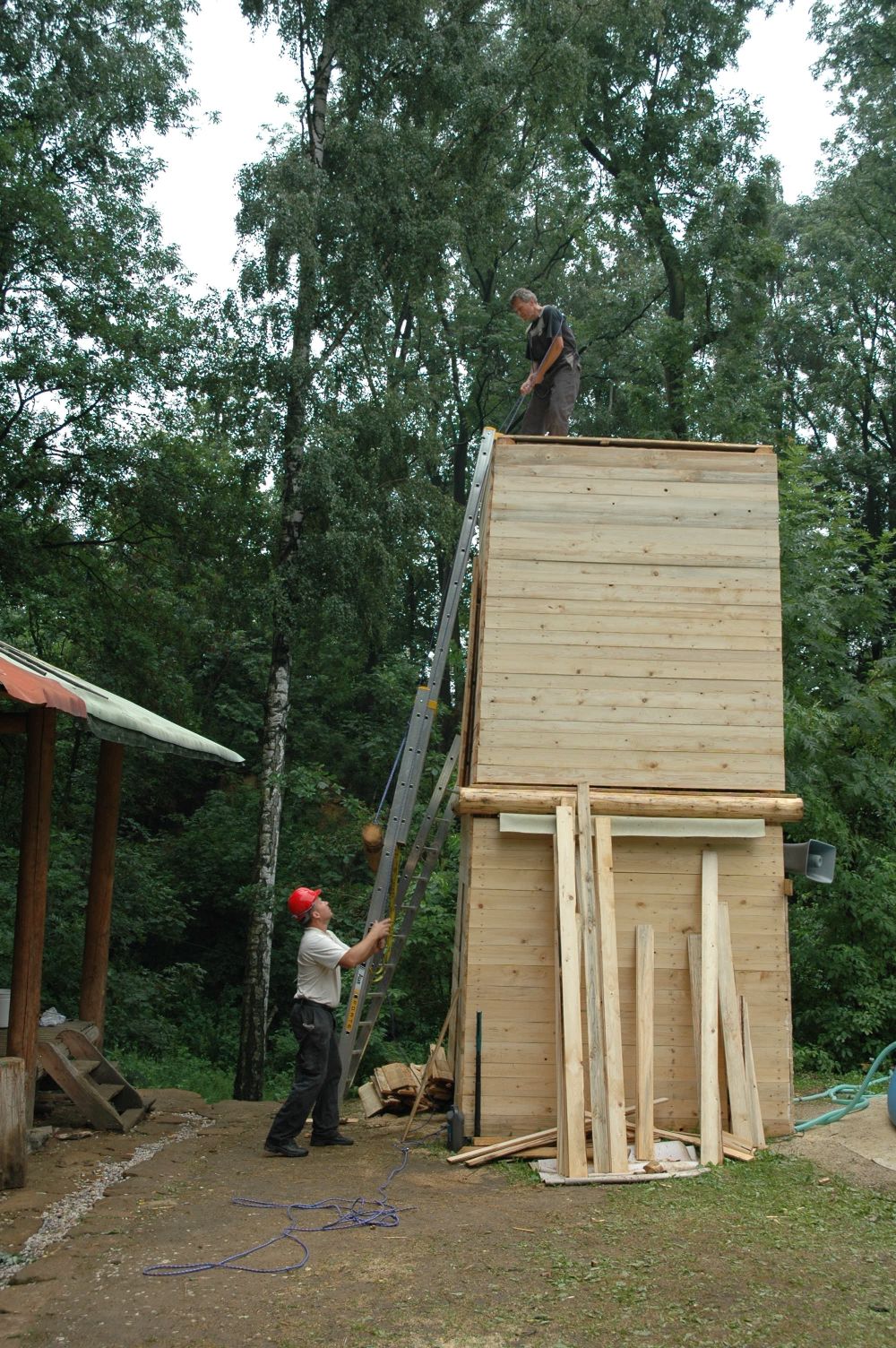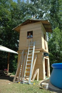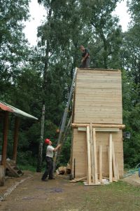 ... výstavba věže, pohled z ní na tábor a téměř hotové dílko ...