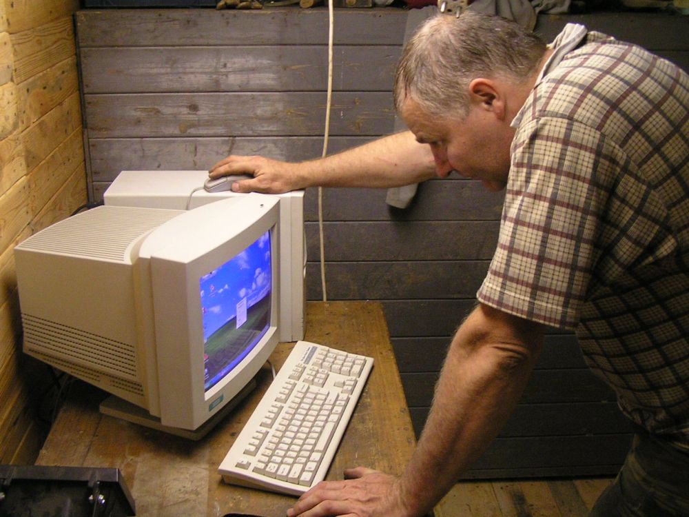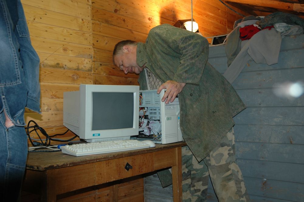 ... a v ještě nehotové kanceláři vedle skladu je instalován první "lesní PC" ...
