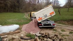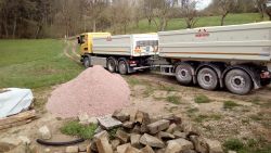 ... "objednaná realizační firma" na cestu "se chytla za nos" a konečně objednala kačírek i štěrk najednou. Najednou to šlo. Šli jsme tedy čekat na soupravu, která už jede. Nakonec jsme se dočkali, souprava vysypala štěrk a vyrazila pro kačírek. Do oběda tam bylo vše, co tam mělo být už před týdnem :-( ...