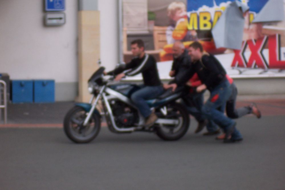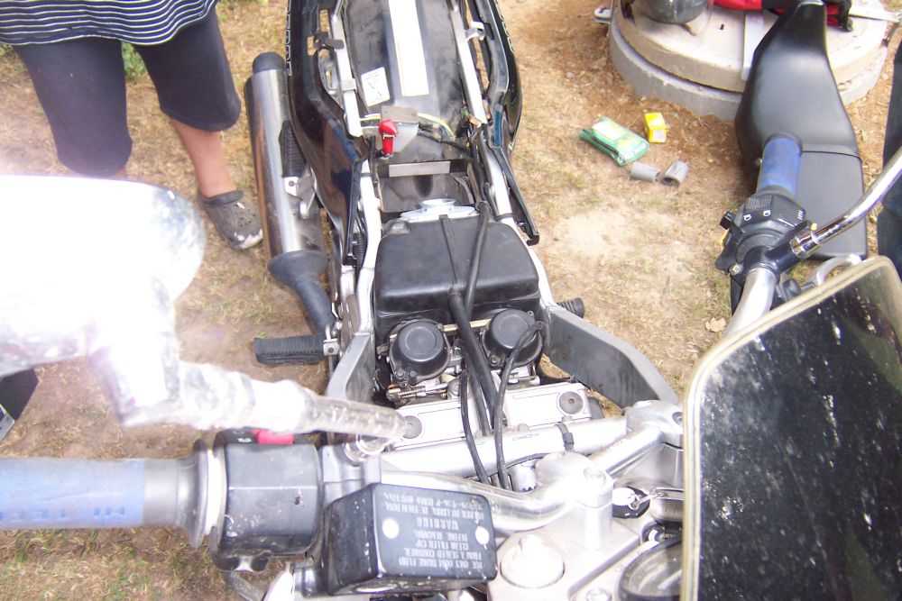 ... "drobný problém" před Lidlem, Vojtovi nejede stroj, nakonec kuckající chytil a dojel na tábořiště, kde byl rozebrán a opraven ...
