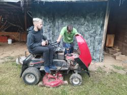 ... Karel, naštěstí pod dozorem, kontroluje stav traktůrku ...