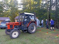 ... Karel, naštěstí pod dozorem, kontroluje stav traktůrku ...